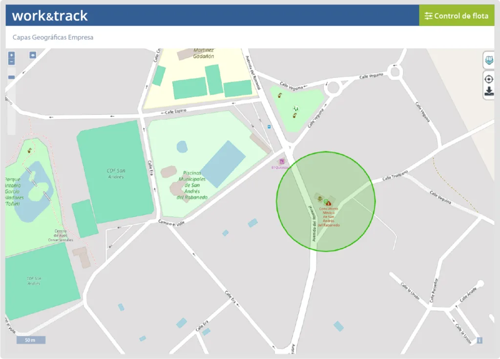 El módulo de Capas Geográficas de Work&track fleet GPS permite definir zonas estratégicas donde monitorizar la actividad de la flota. Estas zonas pueden configurarse como áreas circulares, poligonales o rutas lineales personalizadas sobre el mapa.